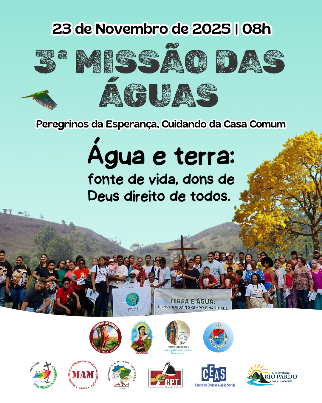 O convite é um chamado aberto à comunidade, pastorais, movimentos sociais e entidades parceiras para defender um modelo de desenvolvimento que respeite a natureza, a cultura e a vida camponesa. A III Missão das águas é uma realização das comunidades Cachoeira, Rio Bonito e Taquaruçu com o apoio da Paróquia São Pedro (Macarani), da Comissão Pastoral da Terra, Centro de Estudos e Ação Social e Articulação Rio Pardo Vivo e Corrente MG/BA, além do Movimento de Pequenos Agricultores (MPA) e do Movimento pela Soberania Popular na Mineração (MAM).
